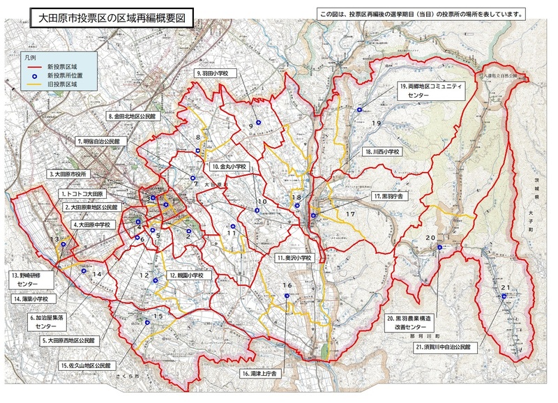 令和7年1月24日に開催しました大田原市選挙管理委員会において、40投票区から21投票区に再編することを決定しました。
