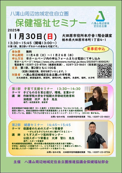 八溝山周辺地域定住自立圏(大田原市・那須塩原市・那須町・那珂川町・棚倉町・矢祭町・塙町・大子町)にお住まいの方を対象に、次のとおり健康や子育て支援に関する講演会を実施します。
