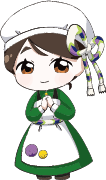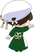 服の緑は本地域の風にそよぐ、木々や草を、前掛けの丸模様はキクの花を表し、花言葉「信頼・長寿と幸福」を込めました。