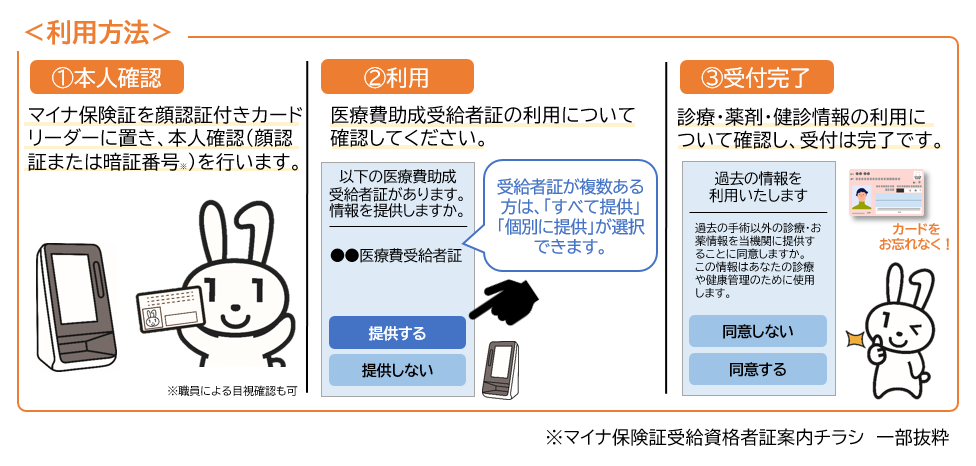 マイナ保険証を顔認証付きカードリーダーに置き、本人確認(顔認証または暗証番号)を行います。 - 利用